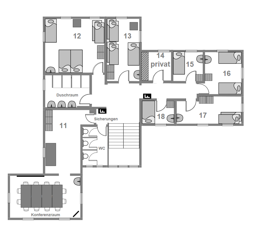 Das Hauptgebäudegebäude wurde ursprünglich um 1892 errichtet, 1960 kernsaniert und anschließend mehrfach modernisiert. Es verfügt über insgesamt 481 m² Nutzfläche, die als Freizeit- und Seminarhaus genutzt wurden. Es besteht aus einer Gastronomieküche inkl Speisekammer mit einer Kapazität für bis zu 100 Personen, Speise- und Cubraum, Büro, Konferenzraum, 12 Mehrbettzimmern inkl. Waschbecken für 38 Personen, 1Einzelzimmer inkl. Badezimmer en Suite, 2 Putzkammern, 3 Toilettenräume mit insg. 7 Toiletten, ein Duschraum mit 4 Duschen