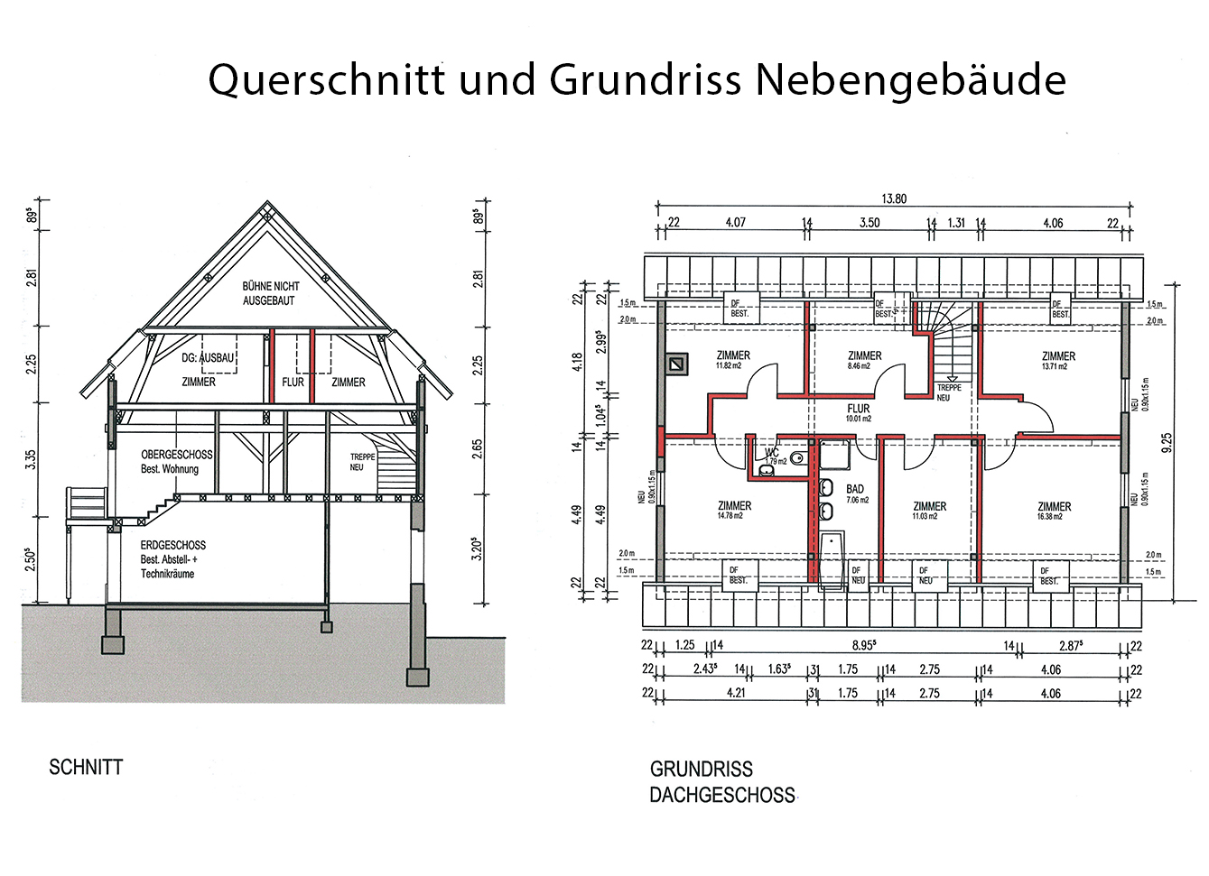 Das Nebengebäude wurde ursprünglich in den Jahren 1856/57 als Scheune errichtet und im Laufe der Zeit mit Sorgfalt zu einem Wohnhaus umgebaut und modernisiert. Heute präsentiert es sich als charmante Wohneinheit mit insgesamt fünf Zimmern, einer Küche sowie einem Badezimmer. Im Erdgeschoss stehen zudem drei praktische Lagerräume zur Verfügung, die vielseitig genutzt werden können – sei es als Abstellfläche, Werkstatt oder für Hobbyzwecke. Die Wohnfläche Nebengbäude beträgt insgesamt ca. 95,04 m² und bietet ein behagliches Wohnambiente und individuellem Charme.